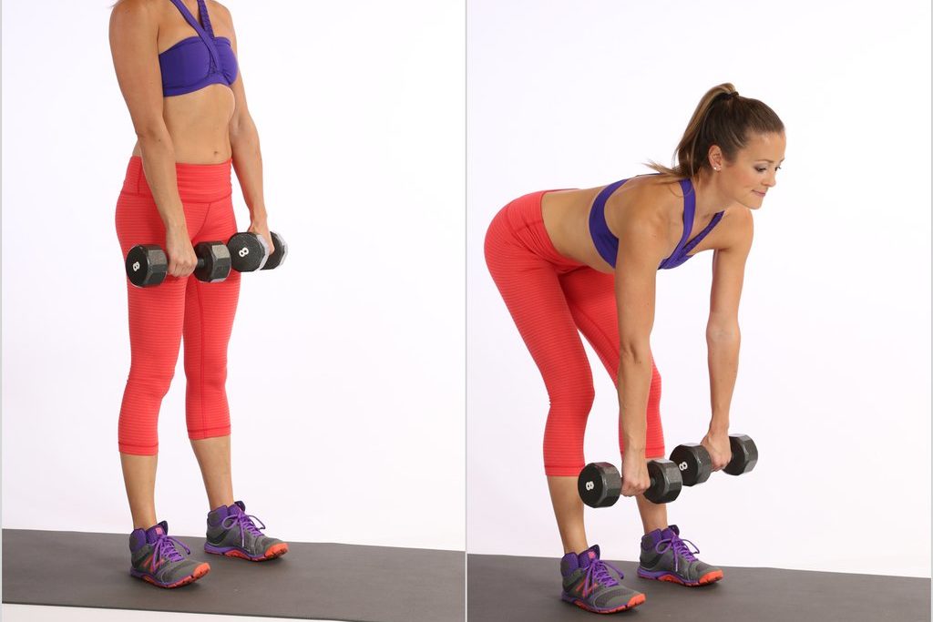 Встаньте прямо, ноги поставив на ширину плеч. Возьмите в обе руки гантели. Гантели держите на уровне бёдер. Опуская гантели к полу, старайтесь не сильно сгибать колени. Не округляйте спину. Вернитесь в исходное положение, напрягая мышцы бёдер.