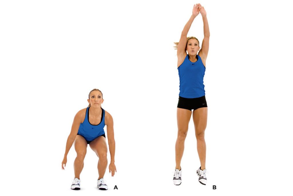 Встаньте прямо, поставив ноги на ширине бёдер. Носки направлены вперёд. Руки сложите в замок и держите на уровне груди. Согните ноги в коленях и прыгните как можно выше. Осторожно приземлитесь и тут же опуститесь в присед. Это – одно повторение.