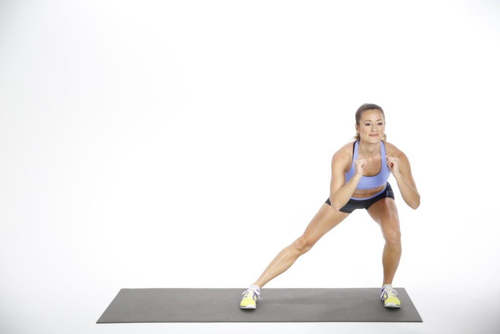Встаньте прямо, поставив ноги на ширине бёдер. Держите руки на уровне груди. Сделайте большой шаг в сторону правой ногой, заведите бёдра назад, согните правую ногу в колене и опустите тело вниз, чтобы правое колено согнулось под углом 90 градусов. Выпрямитесь и верните ногу в исходное положение. Это – одно повторение.