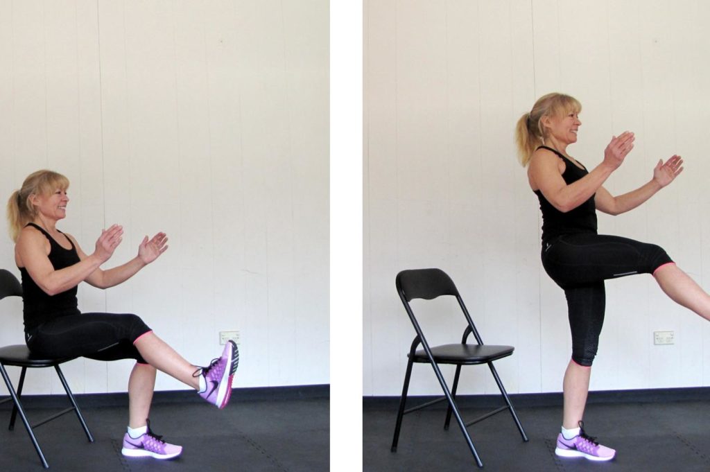 Сядьте на скамью или стул. Поднимите правую ногу и сложите руки перед грудью или вытяните руки в стороны для сохранения равновесия. Распределив вес на левую пятку, встаньте со стула. Сделайте паузу, а затем снова сядьте на стул. Повторите с другой стороны. Это – одно повторение.