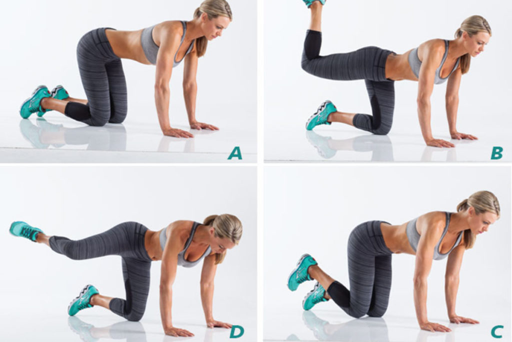 Встаньте на четвереньки на коврик. Ноги согнуты в коленях. Оторвите правое колено от пола и сделайте вращение ноги (сохраняйте угол в 90 градусов) так, чтобы она оказалась позади вас (положение, как в обычном упражнении «Гидрант»). Опустите колено на пол. Это – одно повторение.