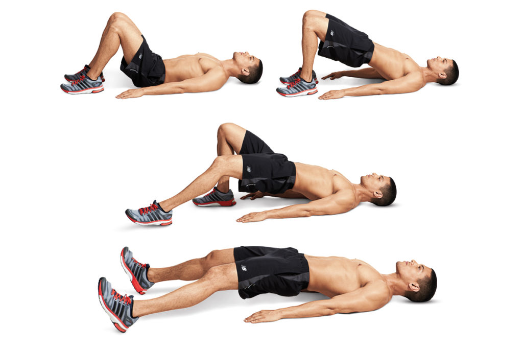 Лягте на спину. Согните ноги в коленях, поставьте стопы на пол на ширине бёдер. Выпрямите одну ногу так, чтобы носок был направлен вверх. Напрягите мышцы бёдер, сожмите ягодицы и оторвите бёдра от пола. Затем плавно опуститесь вниз, не опуская прямую ногу. Это – одно повторение. Сделайте повторения для этой ноги, а затем её смените.
