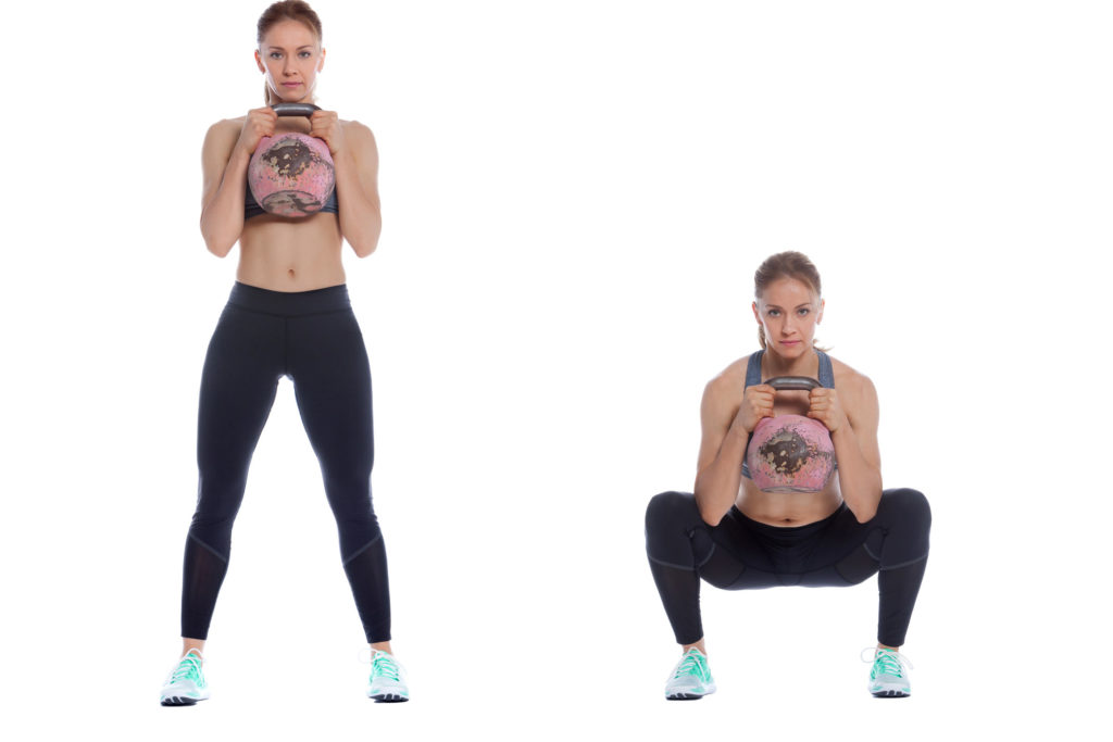 Возьмите одну гирю/гантель двумя руками, держа её на уровне груди. Встаньте прямо, поставив ноги на ширину плеч. Напрягите мышцы пресса, бёдра заведите немного назад. Разверните ноги так, чтобы они были под углом около 30°. Присядьте, заведя колени в стороны так, чтобы локти могли пройти между ними. Держите спину ровной. Сделайте максимально глубокий присед. Вернитесь в исходное положение.
