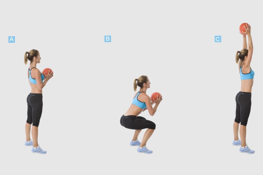 Встаньте так, чтобы ноги были чуть шире ширины бёдер. Обе руки держат по гантели. Согните руки в локтях и поднимите чуть выше уровня плеч. Согните ноги в коленях, как если бы вы садились на стул. Распределите вес на пятки. Выпрямите руки над головой, выпрямив колени, чтобы вернуться в положение стоя. Это – одно повторение.