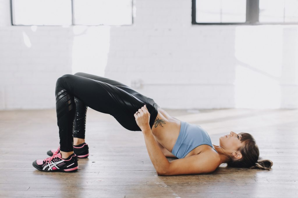 Лягте на спину. Согните ноги в коленях, поставьте стопы на пол на ширине плеч. Напрягите мышцы бёдер, сожмите ягодицы и оторвите бёдра от пола. Задержитесь в верхней точке на две секунды, а затем снова опустите бёдра на пол. Это – одно повторение.