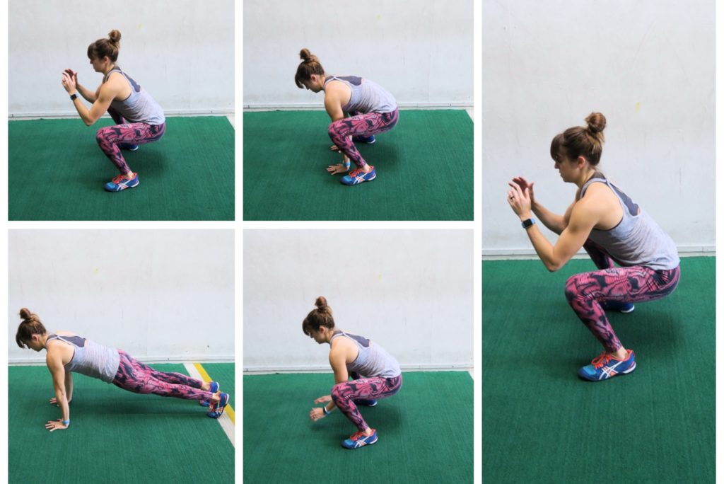 Встаньте прямо, поставив ноги на ширине бёдер. Опуститесь динамично вниз, положив ладони на пол. Сделайте прыжок ногами назад. Без паузы сделайте прыжок вперёд, чтобы оказаться снова на корточках. Встаньте прямо, заведя бёдра назад. Это – одно повторение.