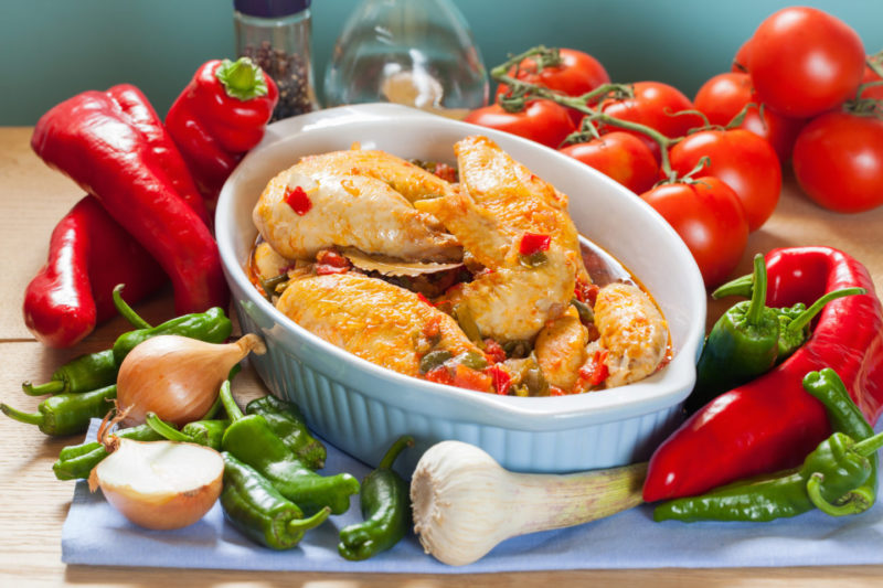 Для начала нарежьте филе кубиками среднего размера и обжарьте их на оливковом масле. Возьмите другую сковороду и также обжарьте нарезанный лук и перец. Обжаренную курицу переложите в сотейник, добавьте томаты в собственном соку, кусочек хамона, воду и специи по вкусу. Тушите цыпленка на медленном огне 5 часов.