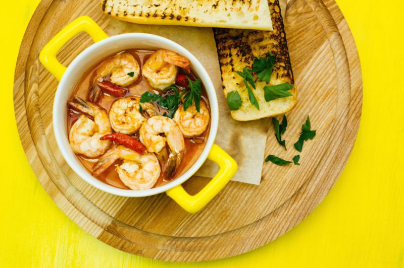 Обжарьте креветки на оливковом масле, добавьте специи и измельченный чеснок. Обжарьте на сухой сковороде багет, а затем подавайте на нем креветки.