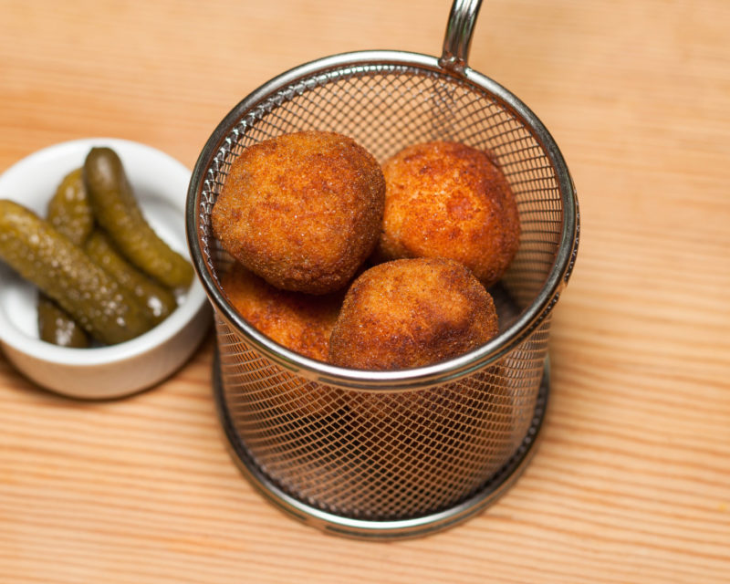 Колбасу и лук перебейте в блендере. Тем временем, разогрейте на сковороде сливочное масло и добавьте муку. Добавьте к муке и маслу чоризо с луком, обжарьте все ингредиенты. После этого добавьте бульон и молоко. Помешивая полученную массу на протяжении 30 минут, приготовьте соус бешамель. Готовый соус отправьте в форму, высотой около 3 сантиметров. Накройте ее пленкой и оставьте в холодильнике на 3-4 часа, до застывания. Сформируйте небольшие шарики, обваляйте их в смеси яйца, муки и панировочных сухарей. Обжарьте шарики во фритюре и подавайте с корнишонами.