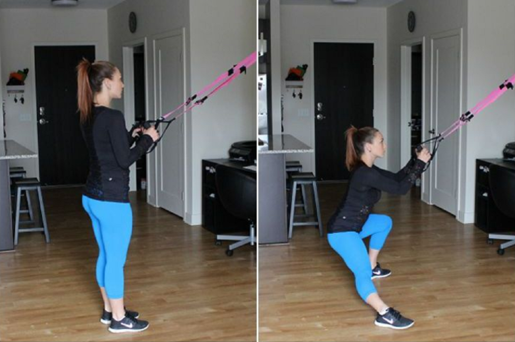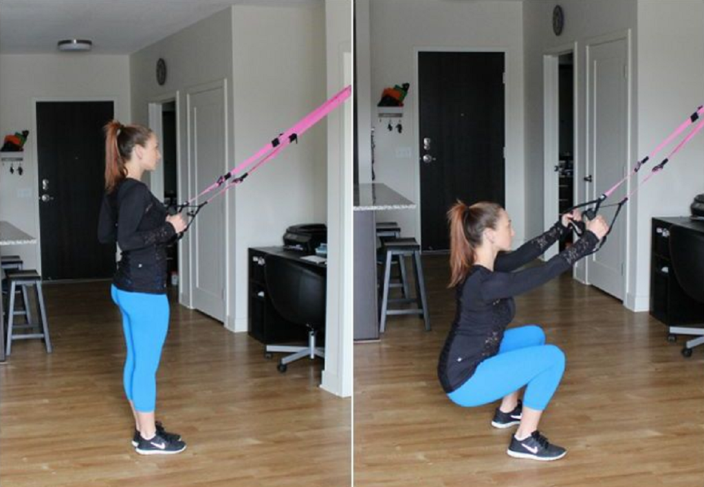 Поставьте ноги на расстояние немного шире плеч, колени и носки разверните в стороны. Ремни возьмите в согнутые руки и удерживайте на уровне груди. Сделайте приседание, перенося вес на заднюю часть стопы. Повторите.