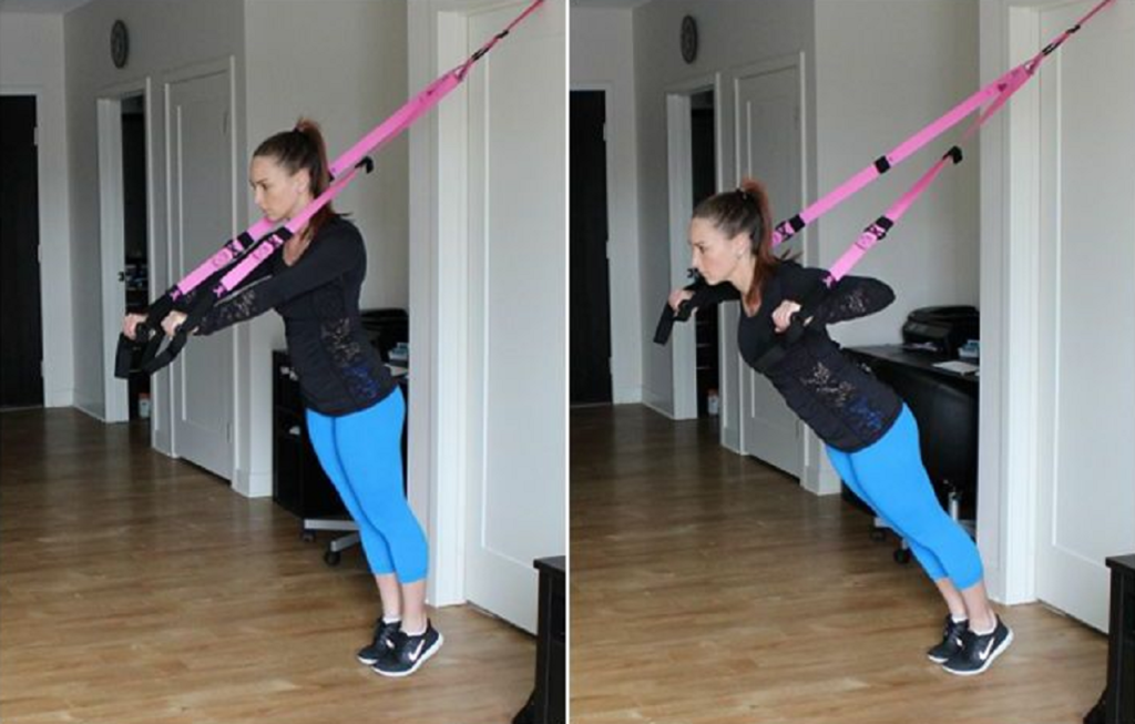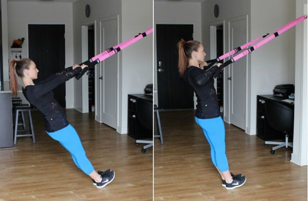Начальная позиция, как на картинке. Натяните петли – туловище отклоните назад, руки выпрямите, упритесь на пятки. Сведите лопатки вместе и выполните подъем корпуса, подтягивая грудь как можно ближе к тренажеру. Повторите 15-20 раз.