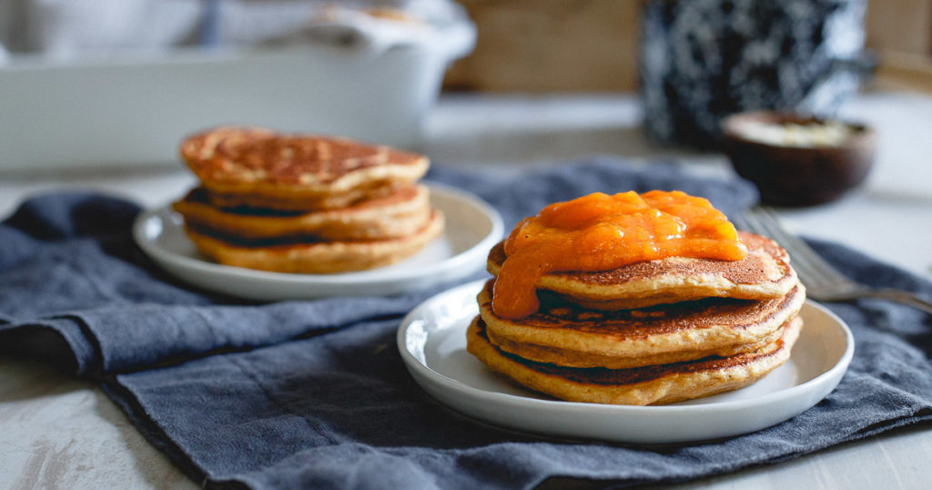 - Приготовьте топпинг из хурмы, соединив остаток пюре с 1/2 чайной ложки экстракта миндаля. Протушите его на медленном огне несколько минут, пока готовятся панкейки.