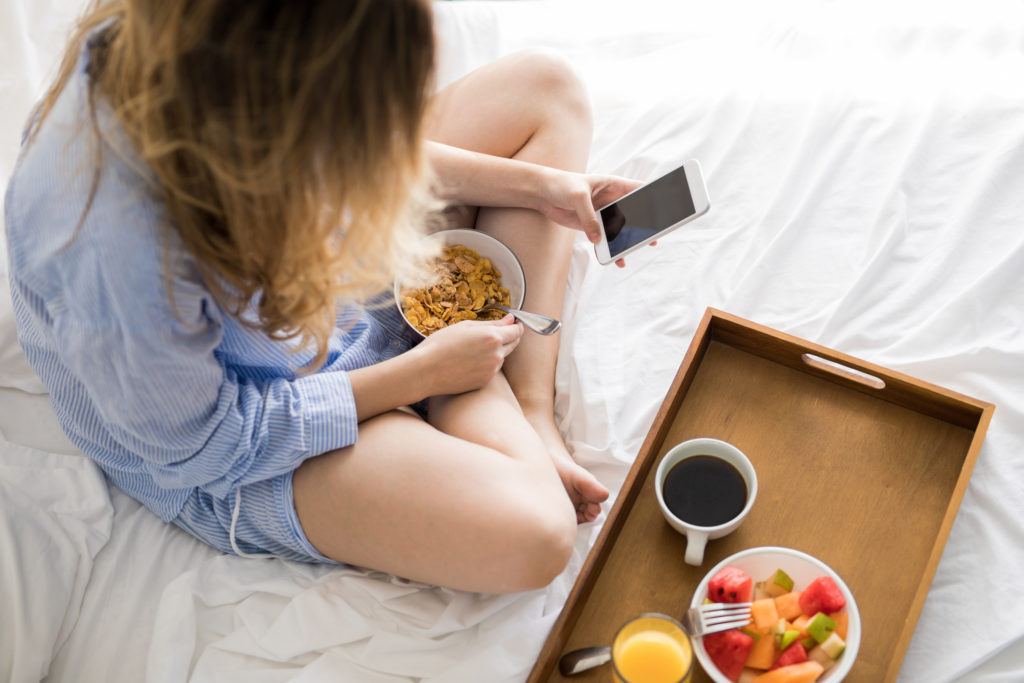 Еда в кровати – верный путь к перееданию! Когда вы смотрите телевизор, переписываетесь с кем-то или заняты в ноутбуке, вы перестаете контролировать, что попадает в ваш организм, и в каком количестве. Также, еда в полулежачем или лежачем положении не идет на пользу перистальтике кишечника, что может затруднить пищеварение и вызвать изжогу.