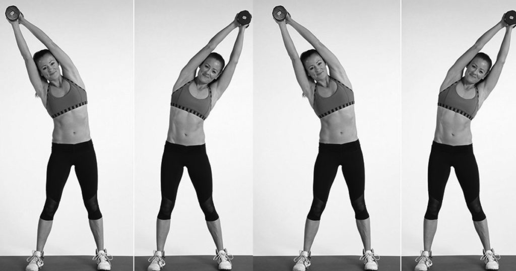 - Держа гантели на вытянутых руках, прогнитесь как можно ниже влево, а затем вправо.