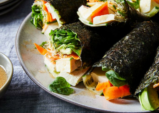 Эта закуска просто идеальна для пикника на пляже! Готовить ее очень просто, а свежие и полезные ингредиенты (шпинат, тофу, морковь, огурец, кунжут, ореховое масло и морские водоросли) подарят вам легкость. Просто заверните все составляющие в лист водорослей нори и наслаждайтесь отличным вкусом!
