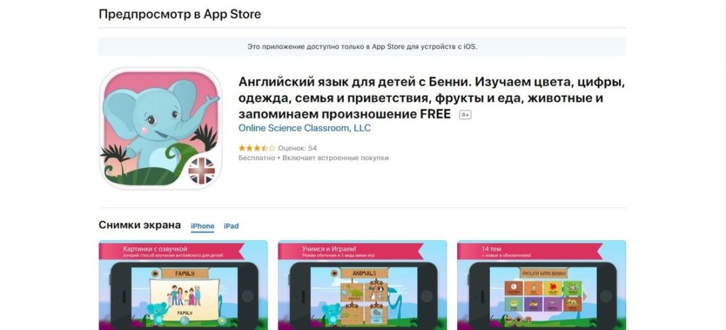 Простая и удобная программа для изучения английского языка.В запасе у слонёнка Бенни более 150 слов, которым он обучит вашего малыша. Кроме слов, ребёнок выучит и фразы по разным темам, таким как числа, семья, продукты питания и цвета. С помощью приложения ребёнок научится и правильному произношению, повторяя диалоги Бенни и его подружки Габи. Безусловный плюс программы — все слова и диалоги записаны носителями языка, что гарантирует правильное произношения.
