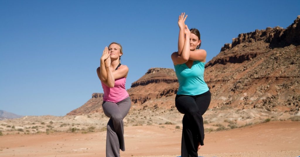 Станьте в позу горы, а затем перенесите вес тела на одну ногу. Поднимите правую ногу, обвив ее вокруг левой. Большой палец левой ноги должен упираться в левую ступню. Теперь правой рукой нужно так же обвить левую, соединив ладони вместе и подняв вверх пальцы. Дыша ровно и глубоко, опустите тело как можно ниже. Сохраните позицию на 15-20 секунд, а затем вернитесь в исходное положение.