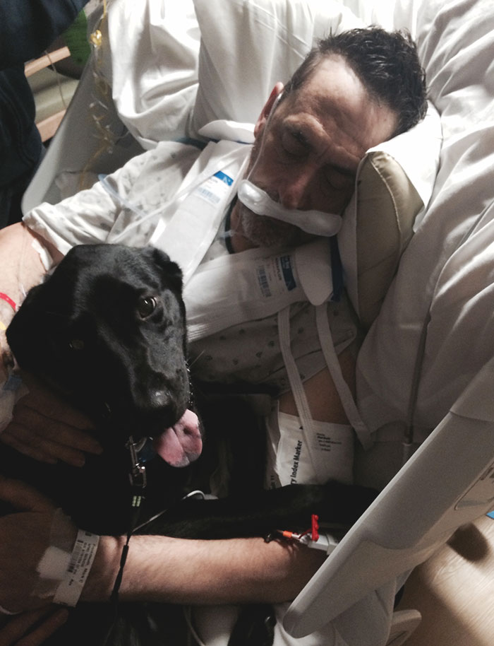 «Сегодня у моего отца день рождения. Всё, чего он хотел, пробыв неделю в больнице, – это увидеть свою собаку, по которой соскучился. Нам удалось договориться о том, чтобы собаку впустили в палату. Отец был рад этому сюрпризу»