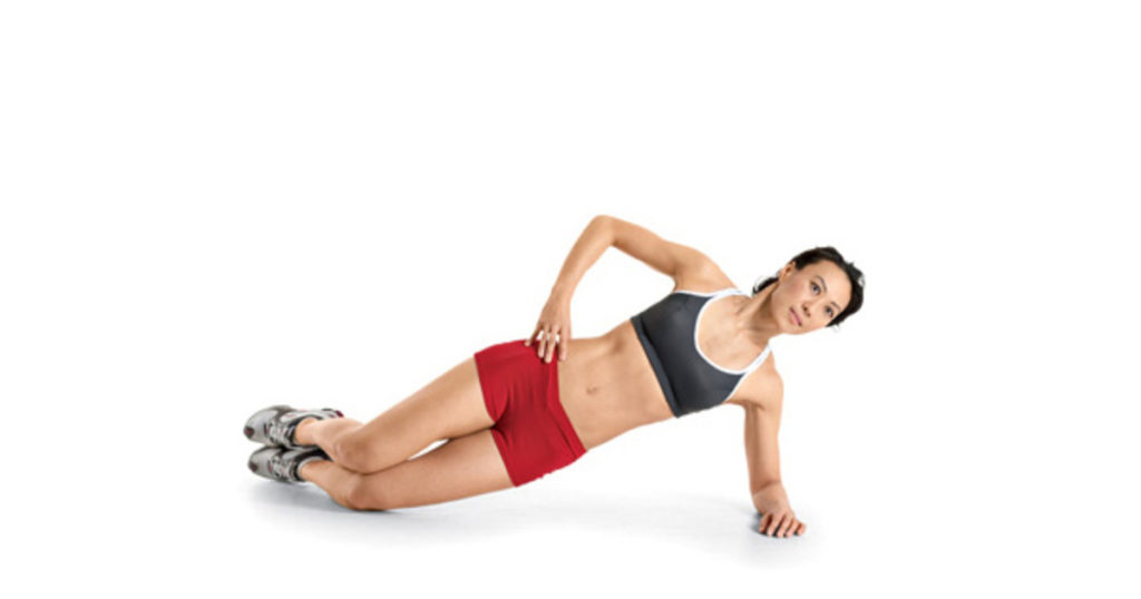 Лягте на правый бок, держа ноги прямо. Сделайте упор на правый локоть и предплечье так, чтобы правая рука была перпендикулярна полу. Левую руку поставьте на левое бедро. Втяните живот и, спокойно дыша, оторвите таз от пола так, чтобы ваше тело образовало прямую линию — от лодыжек до плеч. Напрягая пресс, задержитесь в таком положении 30 секунд, а затем снова опуститесь на коврик. Повторите на левой стороне.