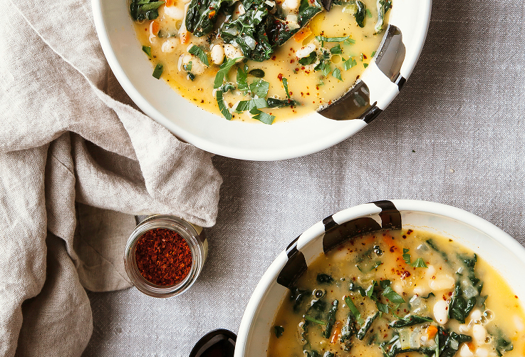 Нагреть масло в среднем горшке на среднем огне. Добавьте лук, морковь и сельдерей в горшок и перемешайте. Тушите овощи до слегка размягченного и полупрозрачного состояния, около 5 минут. В горшок добавьте чеснок, чили и розмарин. Перемешать и варить, пока чеснок не станет ароматным, около 30 секунд. Добавьте бобы и перемешайте. Добавить овощной бульон в горшок и еще раз перемешать. Довести суп до кипения. После кипячения, наполовину перелейте суп в блендер. Добавьте лимонный сок. Осторожно смешайте, пока эта порция супа не будет полностью сжижена. Вылейте эту сжиженную часть обратно в горшок. Приправьте солью и перцем. Добавьте капусту или щавель, доведите суп до кипения. Подавать, присыпав петрушкой.