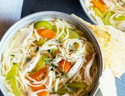 Поместите большую кастрюлю на среднем огне и расплавьте масло. Добавьте лук, морковь и сельдерей и готовьте в течение 2 — 3 минут. Приправить солью и перцем. Добавьте чеснок и продолжайте готовить в течение 2-3 минут или пока лук и сельдерей не станут полупрозрачными. Размешайте в тимьяне и луке и продолжайте тушить в течение 2 — 3 минут. Налейте бульон в горшок и доведите до кипения. Приправить солью и перцем. После того, как суп закипит, добавьте сломанные спагетти и курицу, перемешайте и варите на медленном огне в течение 6-8 минут или пока лапша не станет мягкой и приготовленной. Отрегулируйте приправы и подавайте.