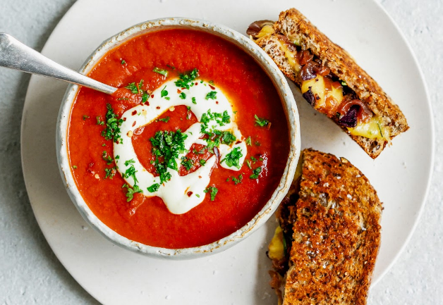 Добавьте лук на разогретой оливковое масло, хорошо засыпьте солью и перцем и готовьте на среднем огне в течение 10 минут до мягкого состояния. Добавьте чеснок, помидоры, сахар, чили, розмарин, томатную пасту, 1/4 стакана крема и готовьте в течение 35 минут.Сделайте пюре из этого супа.Смешайте йогурт с оставшимся кремом и посыпьте петрушкой. Подавайте к супу.