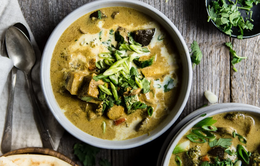 Добавьте в кастрюлю овощной бульон и кокосовое молоко и соль и перемешайте. Добавьте оставшиеся овощи и травы. Готовьте в течение 25 минут. При необходимости отрегулируйте приправу. Подавать теплым с кинзой или зеленым луком и плоским хлебом.