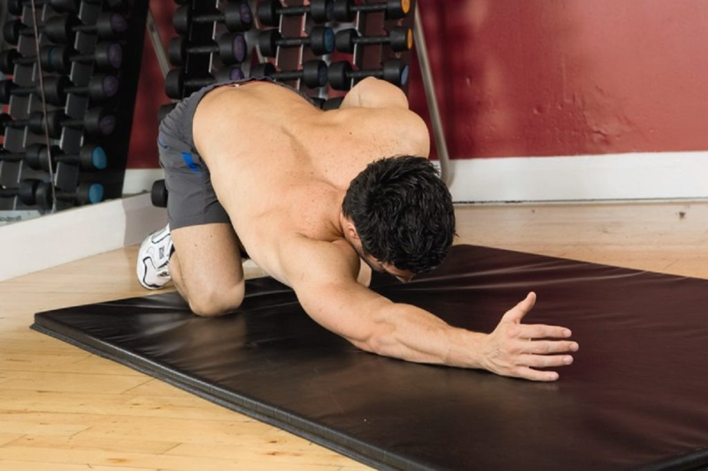 Встаньте на колени, наклонитесь вперед. Вытянутая левая рука отведена назад, правая – вперед. Не оказывая давления рукой, старайтесь опустить плечи как можно ниже, буквально касаясь пола. Оставайтесь в таком положении 30 секунд, затем поменяйте руки.