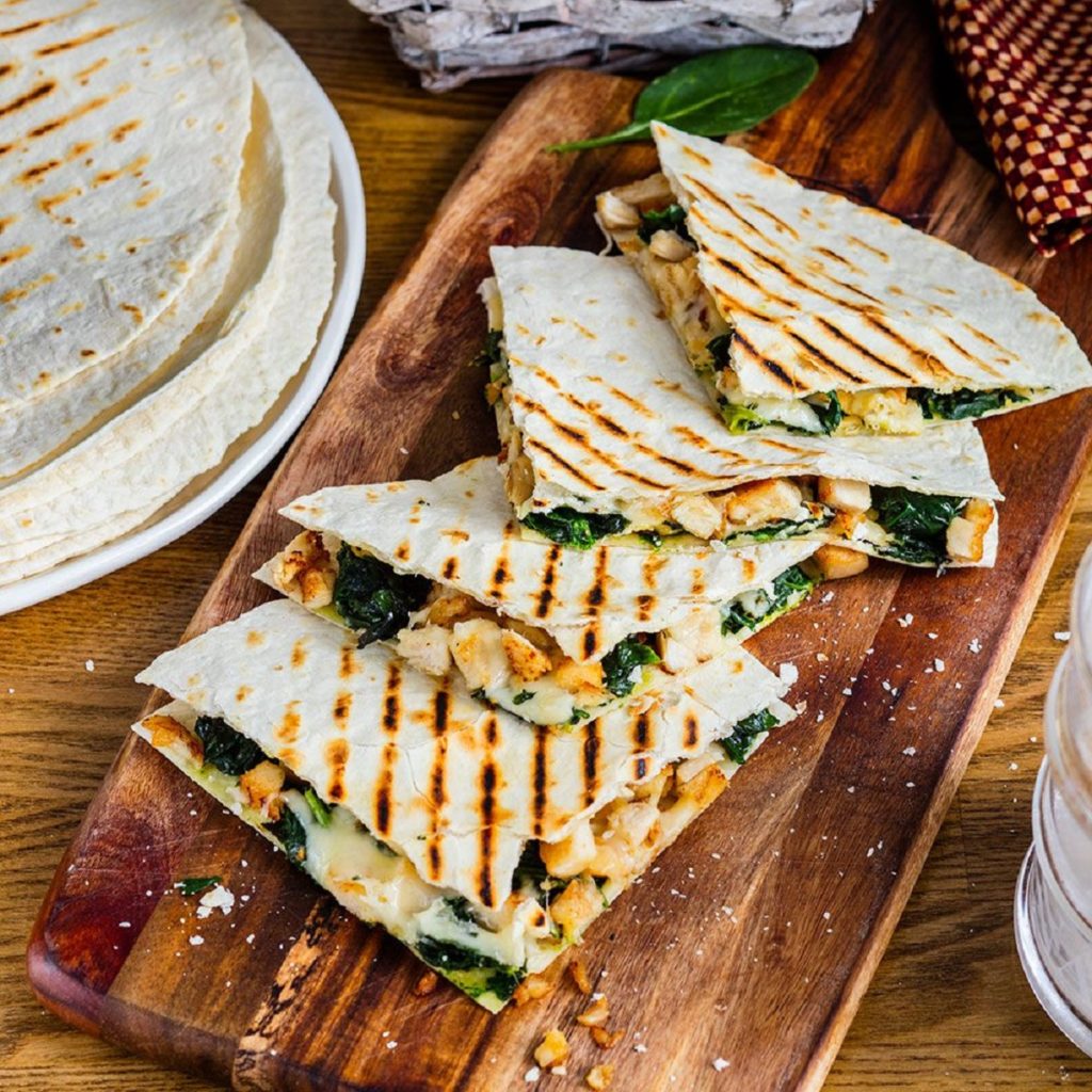 Нагрейте сковороду на среднем огне, добавьте немного оливкового масла. В небольшой миске смешайте сливочный сыр и чесночный порошок. Смажьте этой смесью лепешки. Поместите лепешки на сковороду и выложите оставшиеся ингредиенты сверху. Большие лепешки можно разрезать пополам и свернуть в форме полукруга, а маленькие необходимо накрывать еще одной лепешкой, чтобы начинка оказалась между ними. Обжарьте кесадильи с обеих сторон до золотистой корочки. Подавайте к столу!