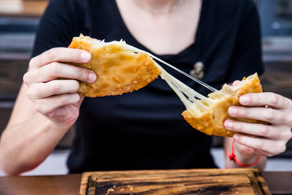 Из муки, дрожжей, мацони, яиц, растительного масла и соли вымесить тесто, оставить его подходить на 30 минут. Тесто раскатать, в середину выложить большую часть сулугуни, накрыть краями теста. Еще раз слегка прокатать скалкой и смазать слегка взбитым яйцом.