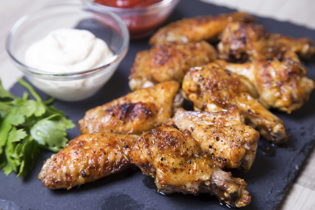 Обжарить крылышки на сковороде или на гриле. Подавать их с соусом и брусочками моркови и сельдерея.