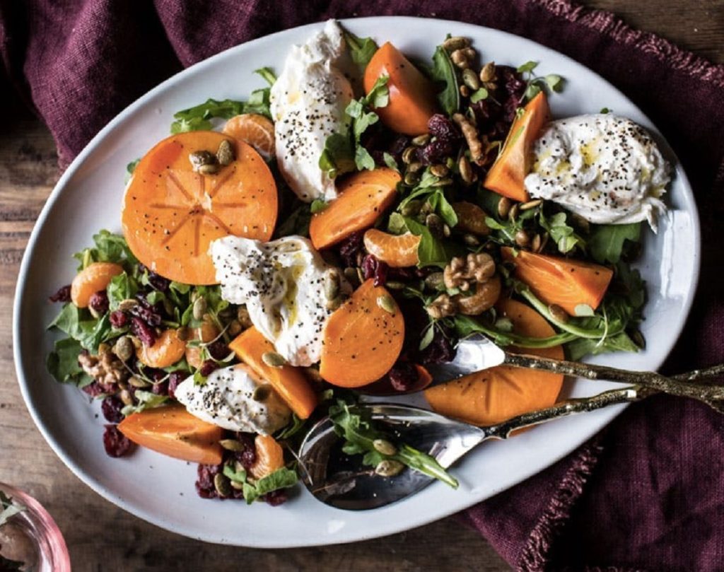 - В большой миске или на большой сервировочной тарелке объедините зелень, хурму, клементины и клюкву. Добавьте порванный сыр Буррата и посыпьте грецкими орехами с семенами тыквы. Приправьте оливковым маслом или нежирной сметаной (йогуртом).
