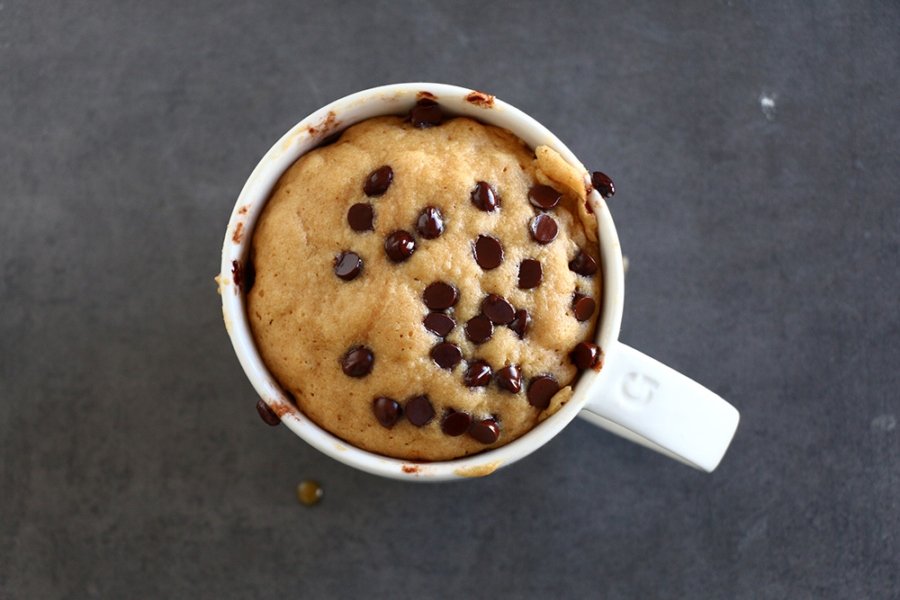 Смешать муку и разрыхлитель. Добавить все остальные смешанные ингредиенты (кроме шоколада) и хорошо размешать. Вылить смесь в большую кружку (или две маленькие), сверху посыпать шоколадом. Поместить кружку в микроволновую печь на полную мощность, готовить 2-3 минуты, затем дать немного остыть.