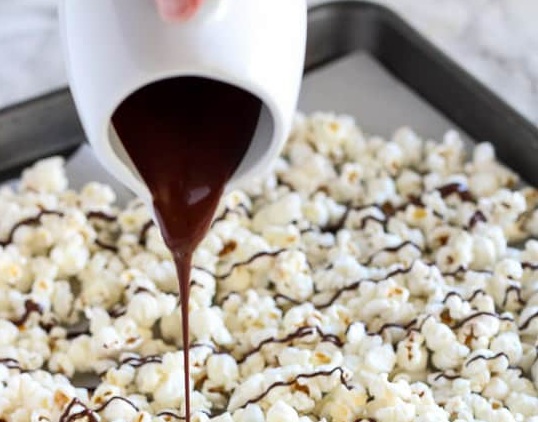 Этот десерт немного сладкий и немного соленый. Попкорн — отличная закуска, потому можно съесть большую порцию и получить небольшое количество калорий. Морская соль усиливает аромат темного шоколада.
