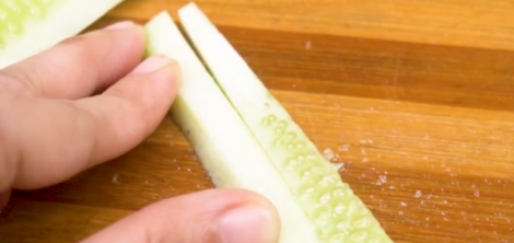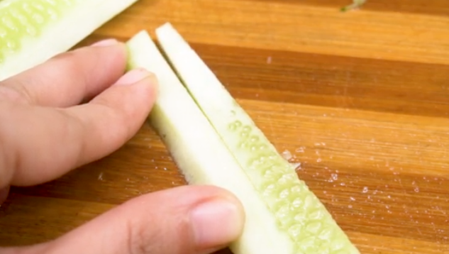 - Огурец нарезать на тонкие полоски. Также порезать и рыбу. Если вы будете использовать и огурец, и рыбу, то всего должно получиться 60 г начинки. Так ролл не будет распадаться.