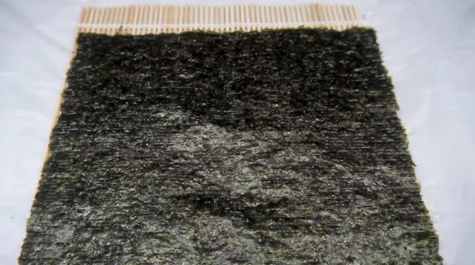 - Положить нори блестящей стороной вниз на коврик. Водоросль является неотъемлемым компонентом любого суши-ролла - она служит основой и оберткой для вашего ролла. Нори довольно деликатный продукт, поэтому обращайтесь с ним осторожно