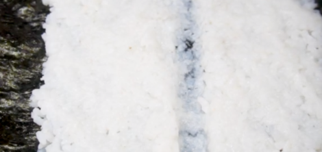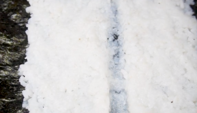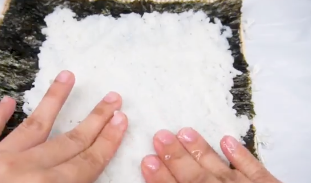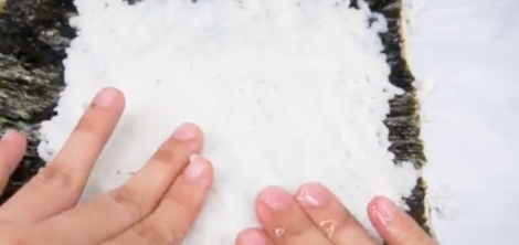 - Нанести тонкий слой риса для суши на лист нори. Аккуратно пальцами распределить его равномерно по нори. Оставьте около 2,5 см пустого пространства в верхней части.