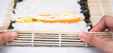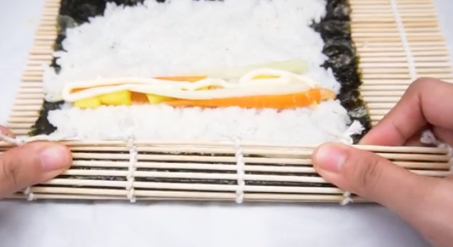 - Свернуть суши снизу вверх, используя коврик в качестве ориентира. Подвести большие пальцы под нижний край коврика и осторожно поднять вверх и вперед, чтобы сложить нижнюю часть нори на себя. Как только вы это сделаете, продолжайте медленно вытягивать коврик вперед, прикладывая легкое давление, чтобы помочь сформировать рулон, пока он не закроется.