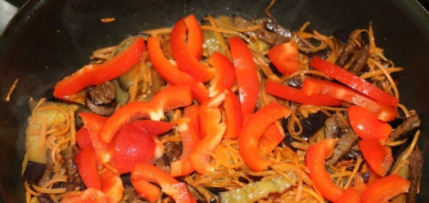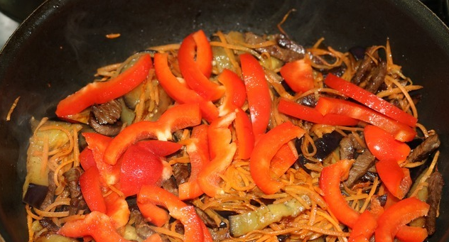- Добавить к мясу баклажаны, нарезанный соломкой морковь и перец. Обжаривать несколько минут.
