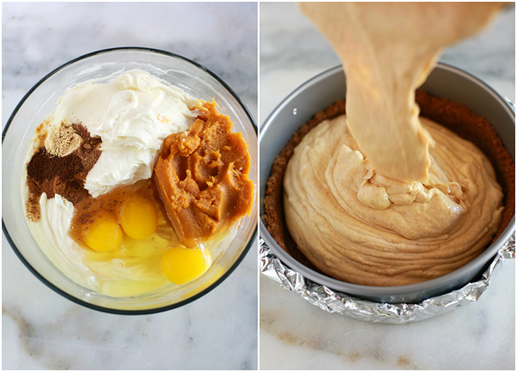 - Выложите имбирную смесь на форму, хорошо вылепите дно и наполовину бока. Выпекайте корочку в течение 5 минут. Выньте из духовки и отложите в сторону, пока вы делаете начинку для чизкейка.