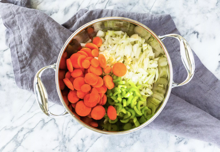 - Разогреть масло в большой кастрюле. Добавить нарезанный лук, измельченный чеснок, нарезанный сельдерей и морковь. Обжарить, помешивая в течение 3-4 минут, пока лук не станет мягким, но не дать им подрумяниться.