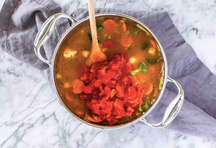 - Добавить лавровый лист, овощной бульон и нарезанными помидорами. Довести до кипения, перемешать, уменьшить огонь и варить, пока овощи не станут мягкими - около 8-12 минут.
