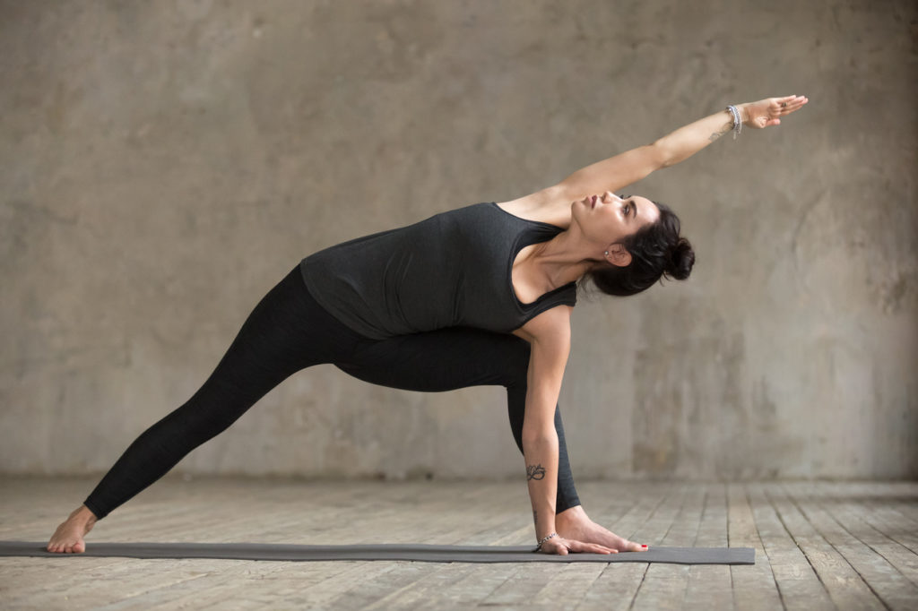 - Выдохните и поверните корпус вправо. Поставьте правую ладонь на пол рядом с правой ступней. Вытяните левую руку над ухом; поверните шею и посмотрите вверх. Оставайтесь в таком положение 20-30 секунд.