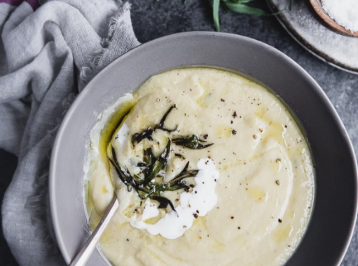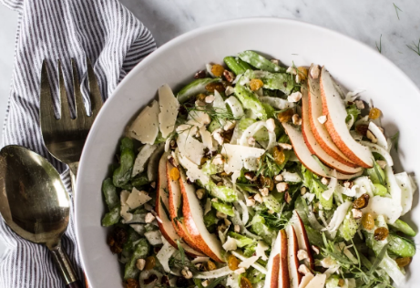 В блендере смешайте все ингредиенты, за исключением нарезанного эстрагона, до однородности. Добавьте ингредиенты для заправки и перемешайте в измельченном эстрагоне. Смешайте заправку и салат. Подавать с листьями фенхеля, тертым фундуком.