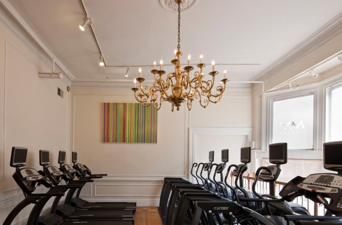 В тренажерном зале по-прежнему есть оригинальный мрамор и паркетные полы, а также гигантская люстра, свисающая с потолка. Нижний этаж тренажерного зала, который когда-то был винным погребом, теперь используется для силовых тренировок, в то время как бывшая гостиная дома, в которой все еще есть рабочий камин, используется для занятий кардио. Вы будете чувствовать себя как дома, работая в этом, ну, доме.