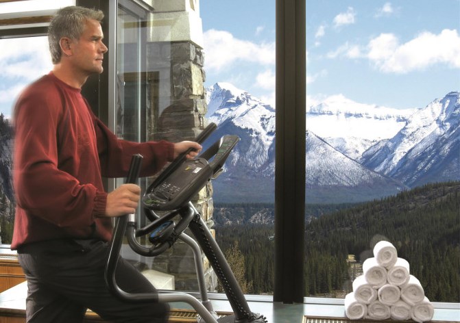 Fairmont Banff Springs стоит посетить по двум причинам: он расположен в самом сердце одного из лучших горнолыжных городов мира и имеет тренажерный зал с несравненными видами. Серьезно — с окнами от пола до потолка с видом на могучий горный хребет Банфа, это будет самая приятная пробежка по беговой дорожке в вашей жизни.