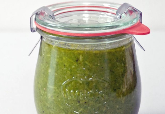 Смешайте оливковое масло, чеснок, грецкие орехи и лимонный сок в блендере или кухонном комбайне до однородности. Добавьте базилик в две партии. Смешайте с тертым пармезаном, добавьте соль и перец.
