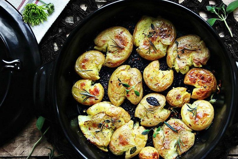 Разогрейте духовку до 210 градусов. Сварите в кастрюле картофель в 10-12 минут или до готовности. Если нож легко проходит, картофель готов. Смажьте противень оливковым маслом. Распределите картошку по поверхности, не надавливайте. Посолите и поперчите по вкусу. Уберите листья с веточек тимьяна и посыпьте их на картофель (веточки должны быть на самом картофеле, а не на противне). Полейте столовой ложкой оливкового масла. Запекайте картофель под крышкой в течение 15 минут в предварительно разогретой духовке. Затем уберите крышку и выпекайте ещё 15 минут. Картофель должен обрести слегка золотисто-коричневый оттенок.