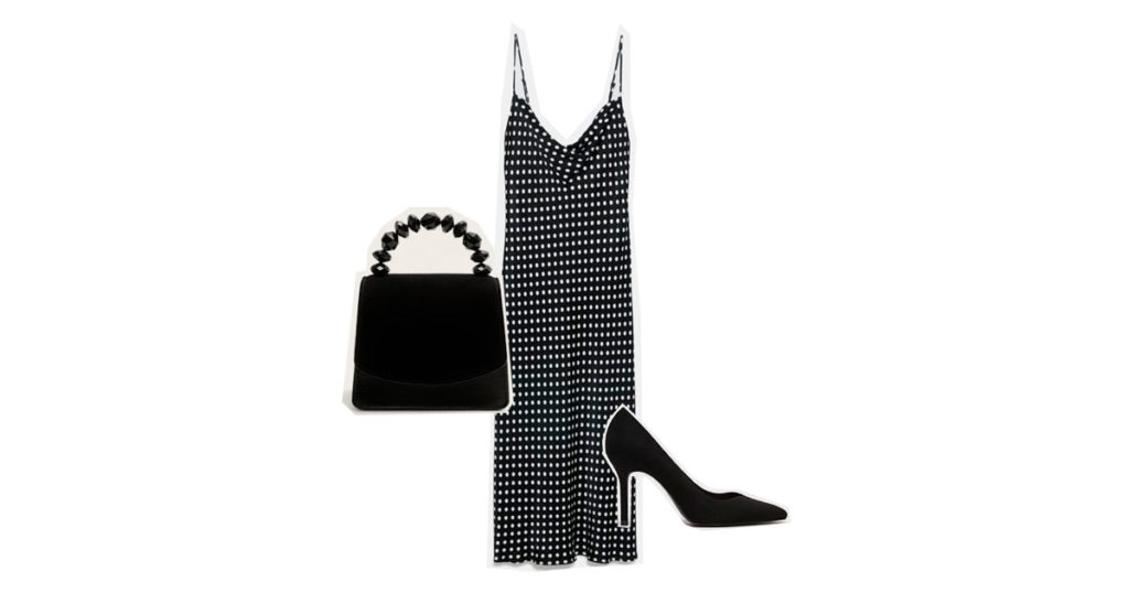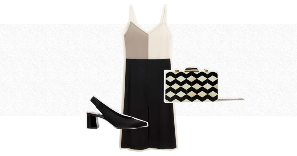 Этот наряд – пример того, как удачно может смотреться на девушках с большими бедрами платье с цветовыми блоками. В этом случае черная юбка визуально сужает нижнюю часть тела, а светлый топ привлекает внимание к груди. Кроме того, сексуальный разрез позволяет подчеркнуть стройные ноги. Безупречным дополнением к подобному платью станут классические черные туфли на среднем каблуке и незаурядная сумочка с геометрическим узором и отделкой под мрамор.