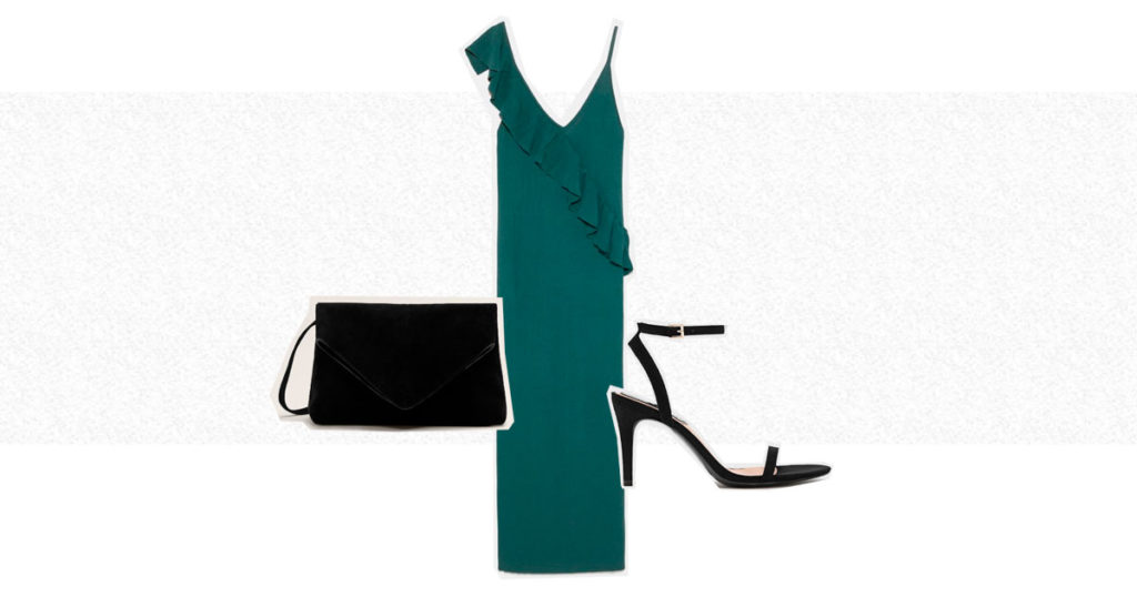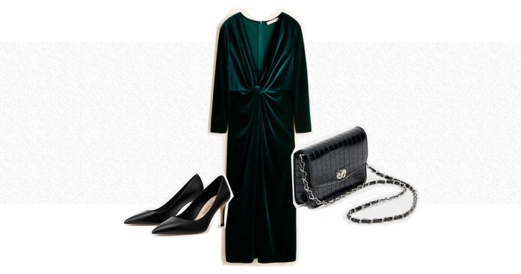 И напоследок – потрясающее изумрудное платье-миди из бархата. Данная модель платья благодаря глубокому темному цвету, плотному материалу, правильной длине и декоративному узлу в зоне декольте, вытягивает силуэт фигуры, акцентирует грудь и сужает бедра. Сочетайте его с кожаными туфлями-лодочками и мини-сумкой с эффектом крокодиловой кожи, чтобы получить безупречный праздничный наряд.